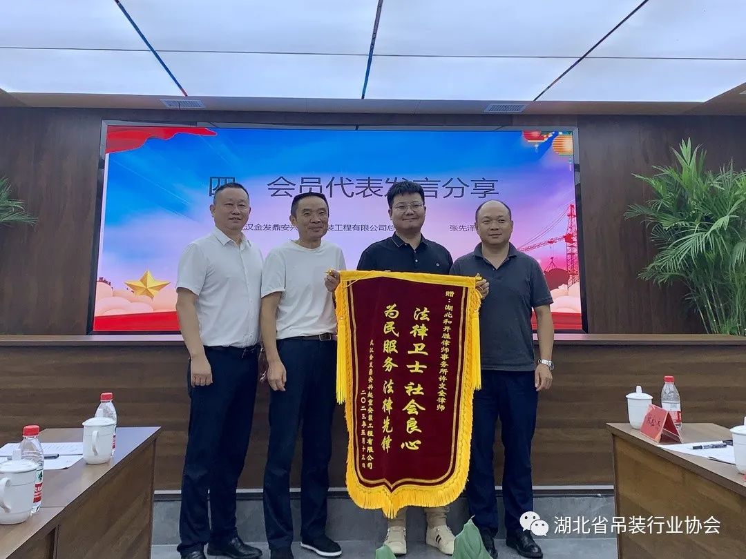 会上,听取了协会服务平台法律咨询、财税咨询、保险咨询、设备维修保养、金融理财、吊装专家库等服务平台与各会员单位服务进度与结果做了汇报。并由会员单位武汉金发鼎安兴起重安装工程有限公司总经理张先泽代表作服务评价。他讲到:协会成立以来,协会分别以线上“调查问卷”、线下“一对一”走访的形式,面对面“联合走访”,以倾听大家对服务需求的期盼。就围绕拓宽协会党建与业务交流平台、举办各种党建红色教育、交流论坛、培训活动,打造企业服务平台,为我们会员拓宽了人脉 ,提升了思路。通过协会服务平台专家资源给我们公司解决了实际的问题,希望各位利用好协会资源平台,把握好时机,紧跟时代步伐,携手协会实现公司发展、行业进步的“同业异业,同轨并进”。并为协会法律顾问湖北和开胜律师事务所的许文全律师送上一面锦旗,对公司给予的帮助表示谢意。