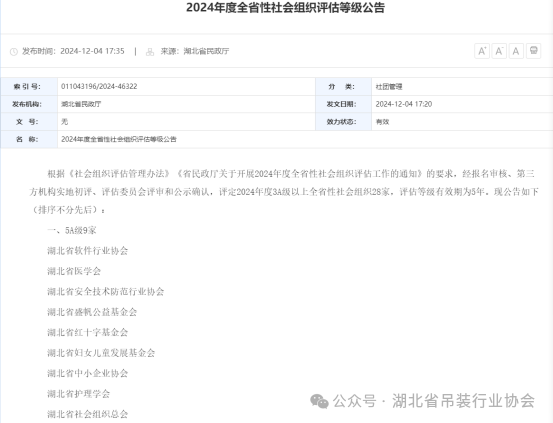 湖北省社会组织等级评估,由湖北省民政厅统一组织,根据《社会组织评估管理办法》、《湖北省民政厅关于开展2024年度全省性社会组织评估工作的通知》的要求,经报名审核、第三方机构实地初评、评估委员会评审和公示确认要求,经过湖北省社会组织评估委员会终评、公示,评估工作具有严格的考核标准和规范程序。从党建工作、基础条件、内部治理、工作绩效、社会评价五个方面进行评估。经过自评申报、专家评估、现场考核、评审委员会终评和社会公示,最终,湖北省吊装行业协会在2024年度社会组织评估中获得3A等级。