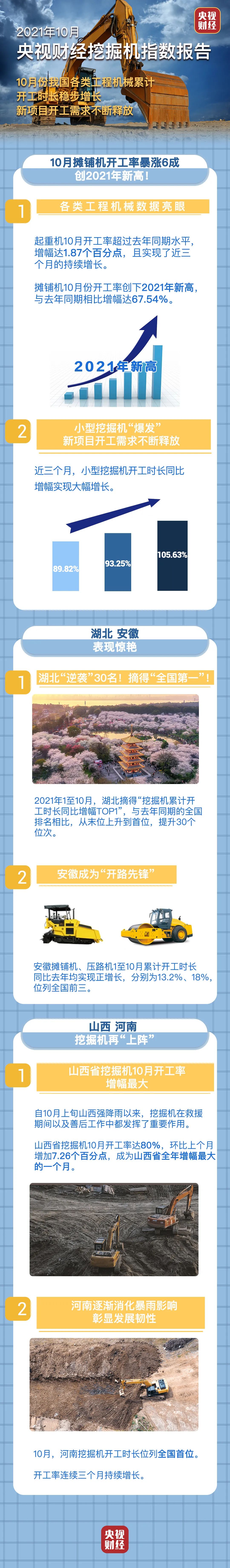 挖掘机是基础设施建设的“标配”,是反映基础设施建设、观察固定资产投资等经济变化的风向标。央视财经与三一重工、树根互联联合打造的“央视财经挖掘机指数”今天发布了10月份相关数据。其中,2021年1至10月,我国各类工程机械累计开工时长继续稳步增长,累计开工时长同比增长率排名前二的机械设备,依次为汽车起重机、搅拌车,增幅分别为18.60%、4.20%。往下看,感受中国基建脉搏跳动。戳长图,一图看懂 ↓↓